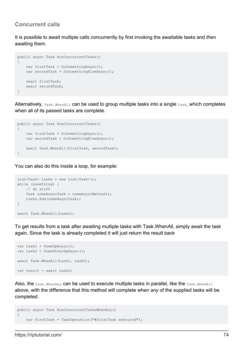 Alternatively, Task.WhenAll can be used to group multiple tasks into a single Task, which completes