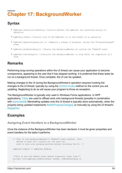 • bgWorker.RunWorkerAsync() //Starts the BackgroundWorker by raising the "DoWork" event