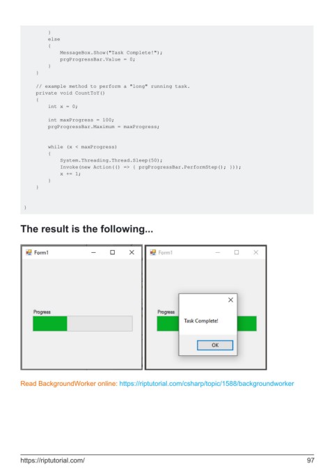 Read BackgroundWorker online: https://riptutorial.com/csharp/topic/1588/backgroundworker