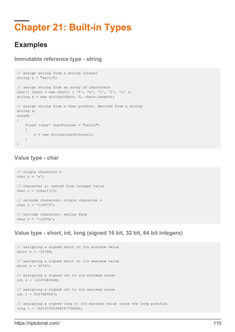Value type - short, int, long (signed 16 bit, 32 bit, 64 bit integers)
