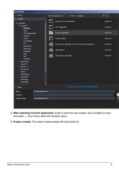 5. After selecting Console Application, Enter a name for your project, and a location to save and press OK. Don't worry about the Solution name. 6. Project created. The newly created project will look similar to: https://riptutorial.com/ 6