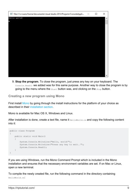 After installation is done, create a text file, name it HelloWorld.cs and copy the following content