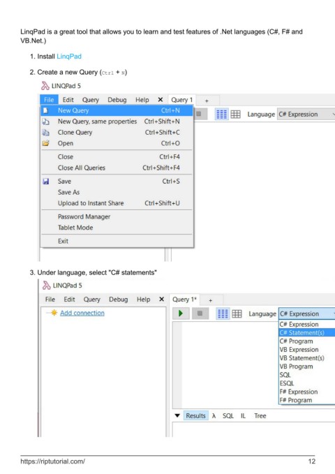 LinqPad is a great tool that allows you to learn and test features of .Net languages (C#, F# and VB.Net.) 1. Install LinqPad 2. Create a new Query (Ctrl + N) 3. Under language, select "C# statements" https://riptutorial.com/ 12