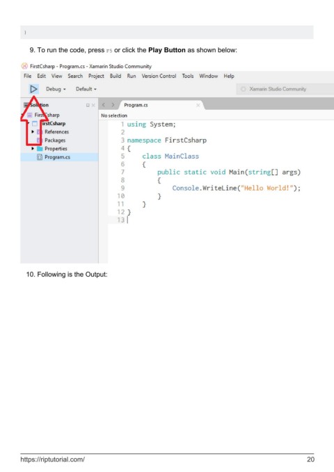} 9. To run the code, press F5 or click the Play Button as shown below: 10. Following is the Output: https://riptutorial.com/ 20