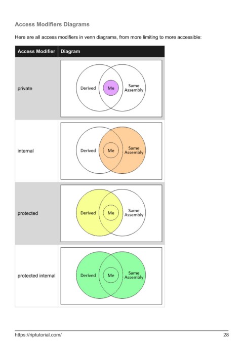 Access Modifiers Diagrams Here are all access modifiers in venn diagrams, from more limiting to more accessible: Access Modifier Diagram private internal protected protected internal https://riptutorial.com/ 28