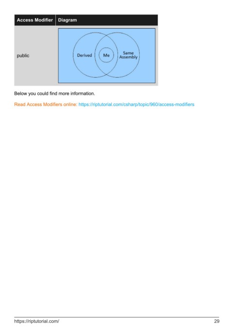 Access Modifier Diagram public Below you could find more information. Read Access Modifiers online: https://riptutorial.com/csharp/topic/960/access-modifiers https://riptutorial.com/ 29