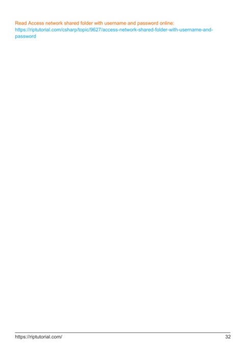 Read Access network shared folder with username and password online: https://riptutorial.com/csharp/topic/9627/access-network-shared-folder-with-username-and- password https://riptutorial.com/ 32